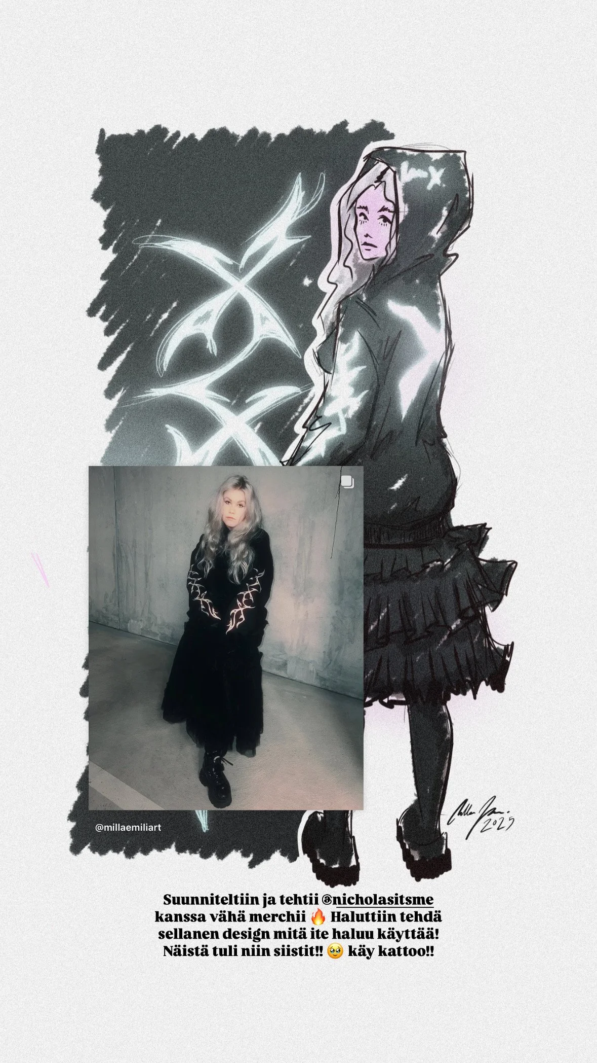 “Milla yllätti kuvauspäivänä printtipaidalla, joka vahvistaa artisibrändiä. Biisin sanat oltiin tuotu mukaan designeen ja se toi kuviin paljon ja tukee tulevaa julkaisua.” — ILO
